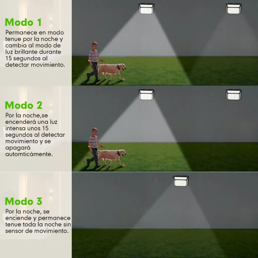 Modos Inteligentes con Sensor: Equipada con sensor radar (3-6 m), control de luz y mando a distancia. Tres modos: 1) Brillo total al detectar movimiento y bajo al irse, 2) Encendido total al detectar y apagado tras irse, 3) Luz máxima continua toda la noche.