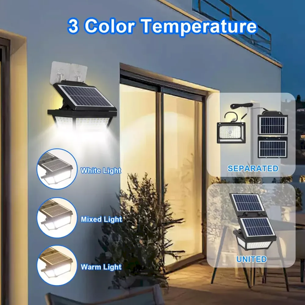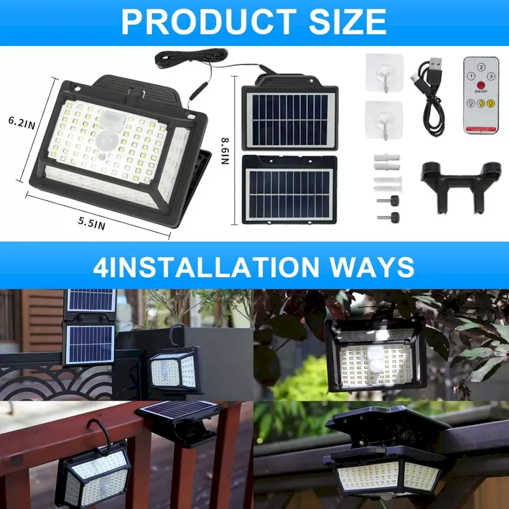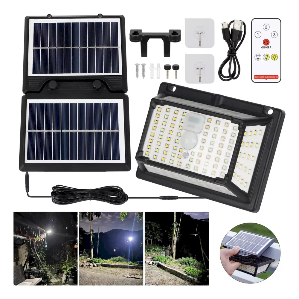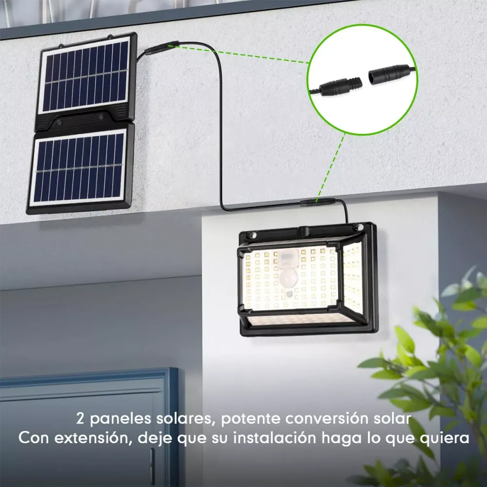 Diseño Duradero y Flexible: Fabricada en ABS+PS resistente a la intemperie, incluye un diseño desmontable con cable alargador para separar el panel solar y la luminaria, permitiendo instalación en lugares soleados y áreas donde se necesite luz.